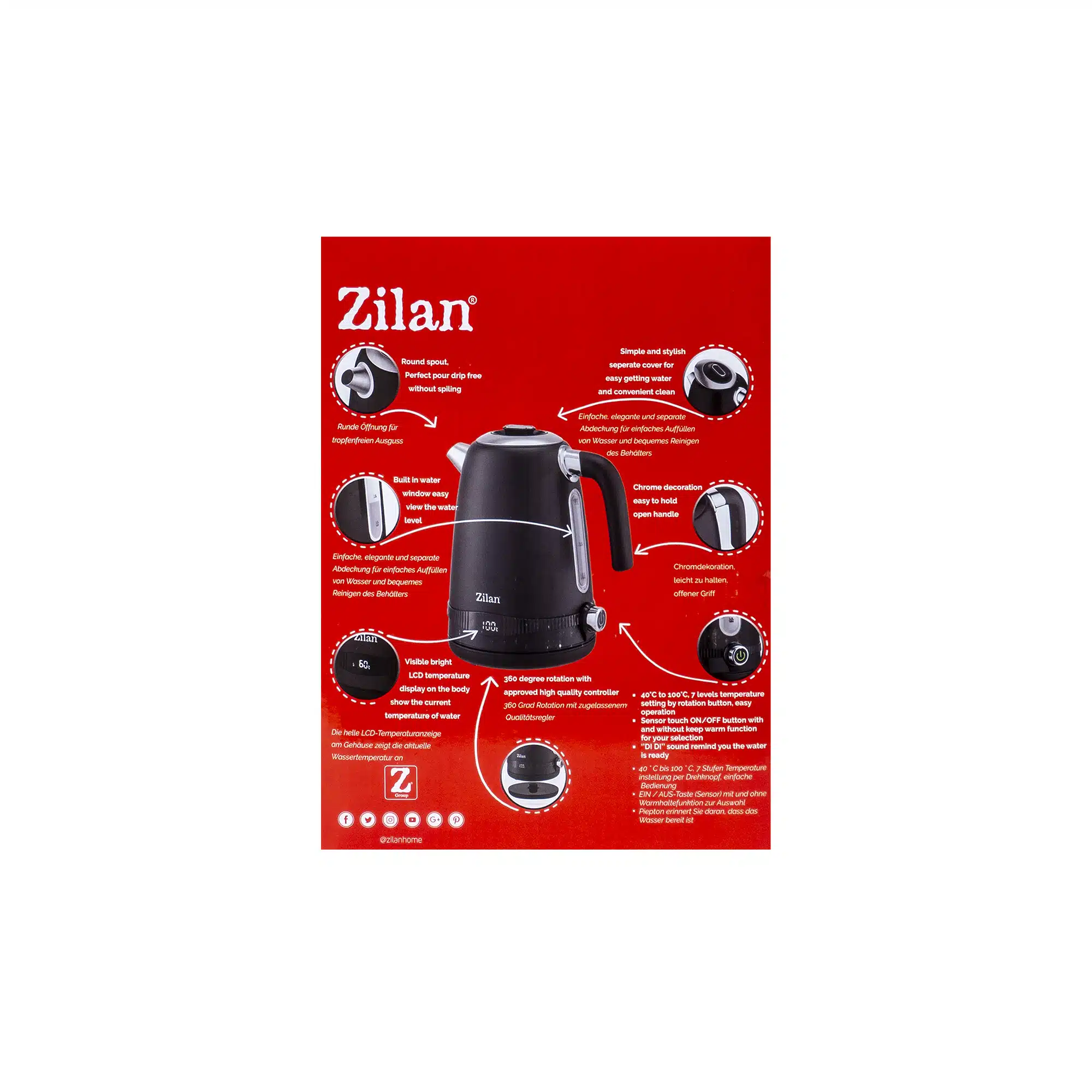 Fierbator electric (ceainic electric) inovator cu afisaj LCD pentru temperatura, control al temperaturii in 7 niveluri si functie de mentinere a lichidului cald. In modul de fierbere a apei, afisajul LCD indica temperatura curenta a apei si se poate fierbe pana la valoarea dorita in intervalul de la 40 ° C la 100 ° C. In modul de mentinere a temperaturii calde, afisajul LCD arata nivelul de temperatura ales permanent in timp ce apa este incalzita ciclic timp de 2 ore dupa care trebuie o alta setare. Usor de utilizat, fiecare ridicare a fierbatorului de la baza reseteaza setarile anterioare. Are un semnal sonor la pornire si un alt semnal sonor la final anunta ca apa este gata.