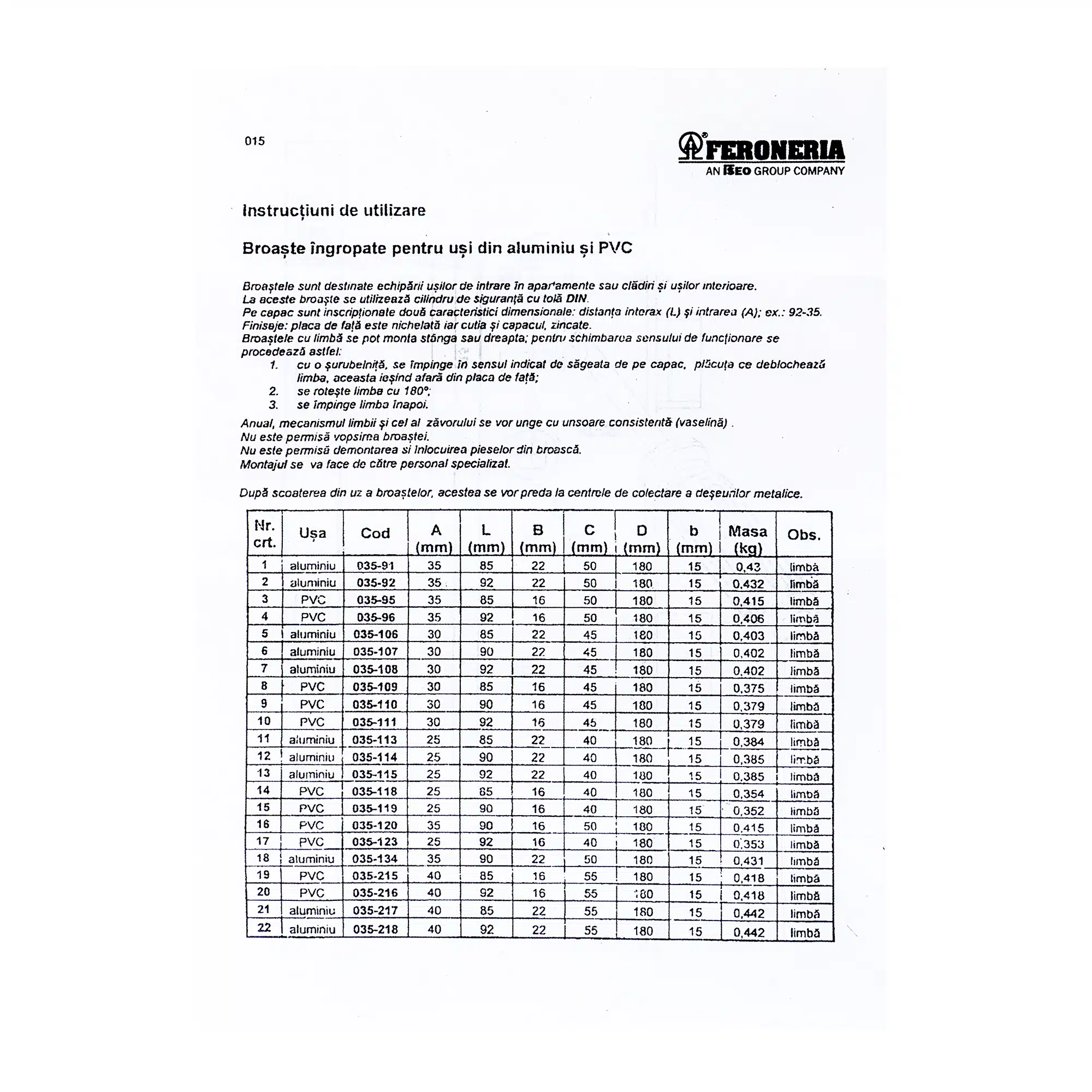 Categorii: Broaste pentru usi din aluminiu, Feroneria
