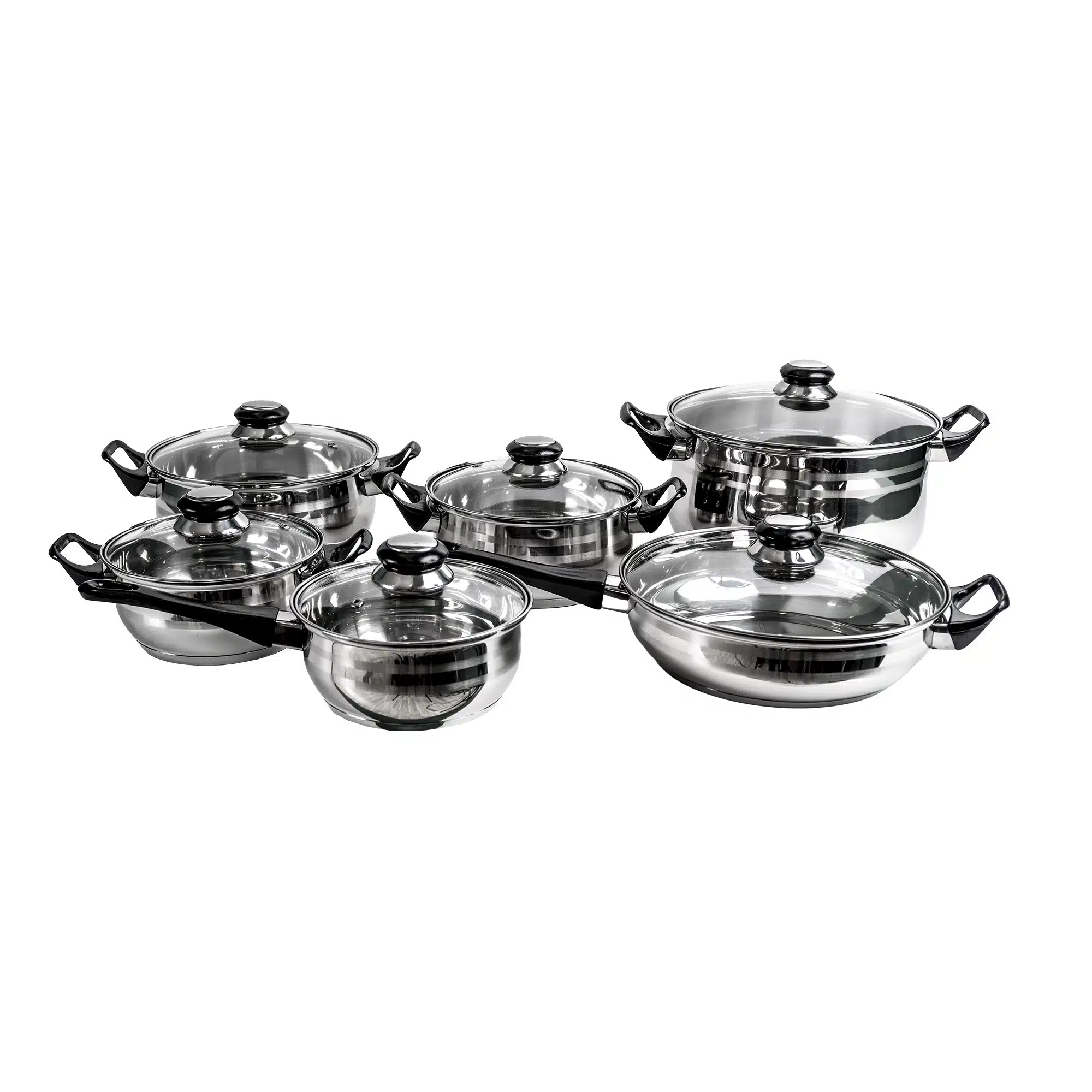 Set oale inox 12 piese, compus din 4 x oale, 1x cratita cu coada, 1x tigaie si 6x capace sticla.