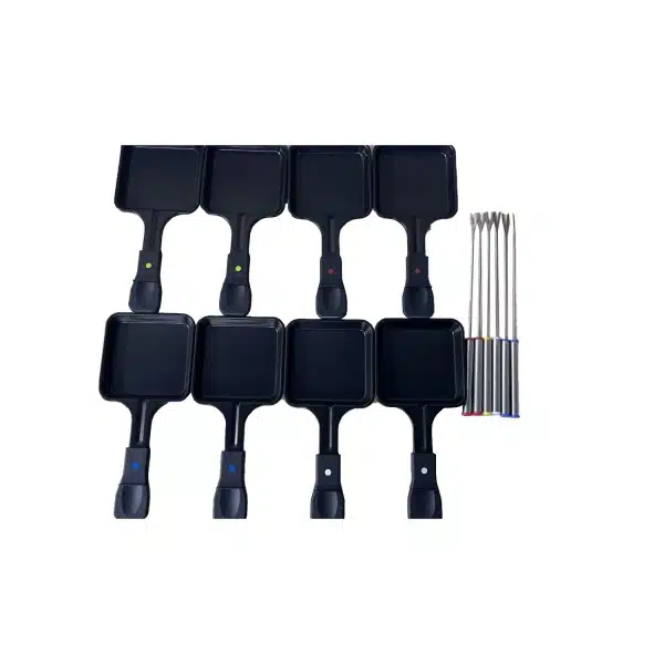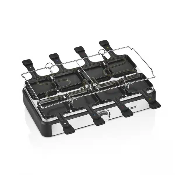 Ce este in cutie: Plita grill/raclette electrica, 8 tigai pentru raclette, 8 spatule, manual de utilizare.