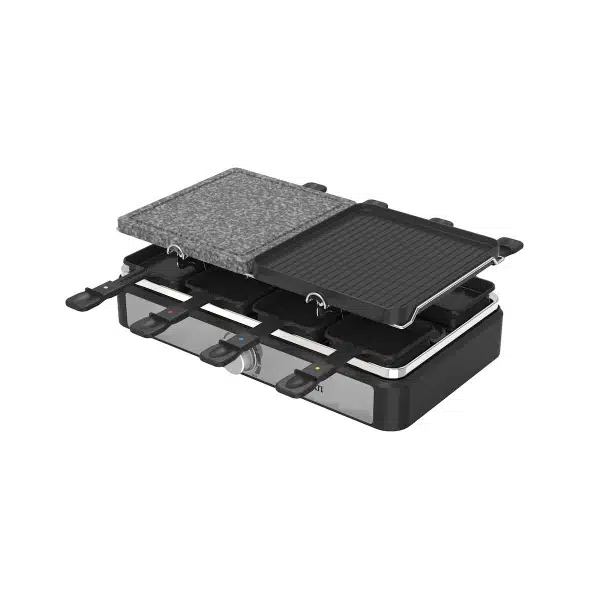 Cu doua placi de 21 x 23 cm (piatra si aluminiu) si 8 tigai pentru raclette, gratarul multifunctional va ofera ocazia sa luati cina in familie sau cu prietenii. Suprafata totala de coacere este de 21 x 46 cm si, prin urmare, ofera suficiente posibilitati pentru a satisface dorintele tuturor.